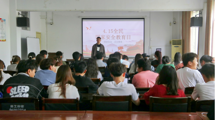尹卓然带领同学们一起观看《国家安全法》宣传视频,介绍了国家安全相关法律法规,涉及政治安全、国土安全、军事安全、经济安全、文化安全、社会安全、科技安全、信息安全、生态安全、资源安全、核安全共11个方面。他以近期国家安全热点话题为切入点,面对面为同学们普及《国家安全法》等系列法律法规内容,深入讲解国家安全知识,传递国家安全观,使群众知晓“什么是国家安全,怎样维护国家安全”。乔沛带领大家一起观看《国家安全教育日专题教育短片》,学习了国家安全的含义、内容等基本知识,全面向学生宣传国家安全举报电话12339,鼓励和引导大家成为维护国家安全的参与者、践行者。