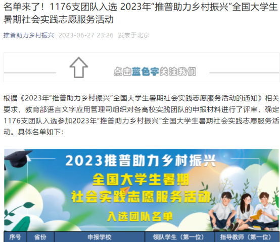 本网讯 (特约记者/路守通) 6月27日,在教育部组织的2023年“推普助力乡村振兴”全国大学生暑期社会实践志愿服务活动中,全国共评选1176支团队,我校生物与化学工程学院社会实践项目《南阳理工学院赴西峡县推普助力乡村振兴服务队》成功入选。