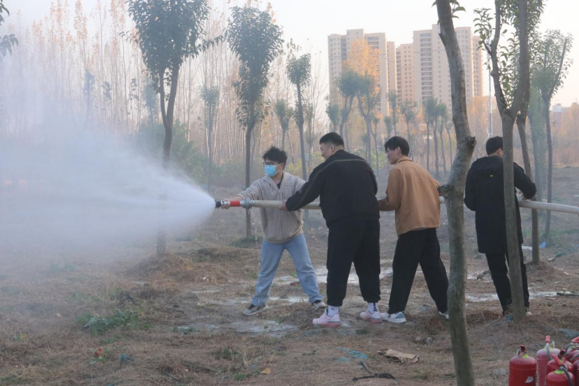 演练开始前,刘学国对此次灭火应急实战演练的流程进行了简单的介绍,并叮嘱同学们认真学习示范操作,在演练过程中注意安全。宋兴华向同学们详细讲解了灭火的方法以及各类消防器材的正确使用方法。随后,在保障安全的前提下,现场模拟火灾事故发生的场景,师生们拿起灭火器和高压水枪进行操作。演练过程中,同学们沉着冷静,行动迅速,操作规范有序。