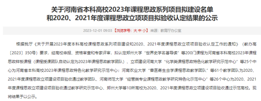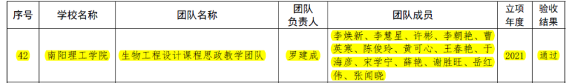 本网讯(特约记者/黄可心)12月1日,河南省教育厅发布《关于河南省本科高校2023年课程思政系列项目拟建设名单和2020、2021年度课程思政立项项目拟验收认定结果的公示》,我院罗建成教授主持的“生物工程设计课程思政教学团队”通过验收,黄可心博士主持的《化工过程环境保护》课程思政样板课获得认定。