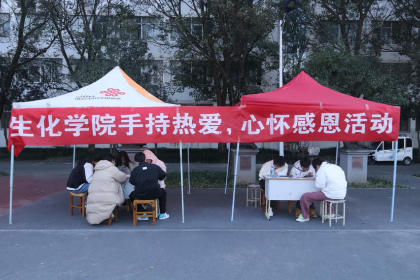 本网讯(学生通讯员/刘宸昕 张宁楠)为培养学生们的感恩之情,引导学生们保持积极乐观的心态,12月2日,生化学院于法治广场举办“手持热爱,心怀感恩”主题活动,部分学生参加。