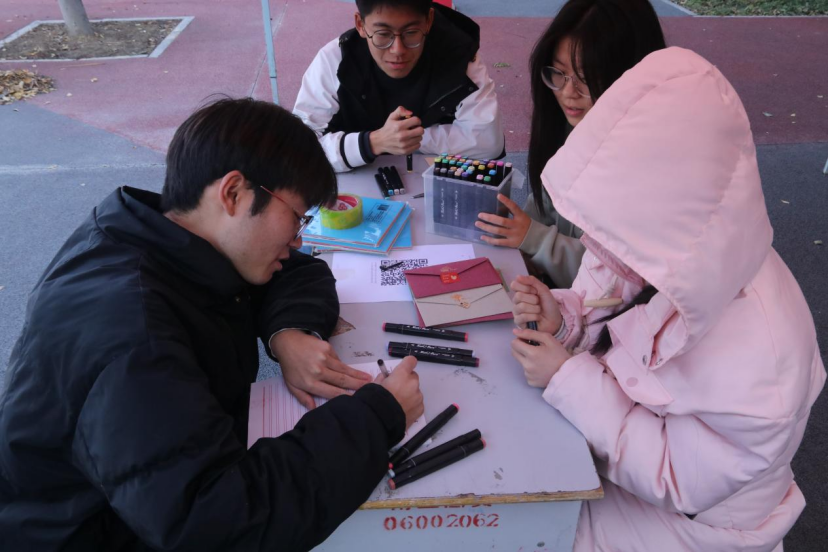 活动过程中,同学们在信纸上给自己想要感恩的人写信,将该信放置于信封中,并对信封进行DIY设计。同学们使用彩纸和马克笔折叠与勾勒出自己的感恩之情。同学们在书信中表达对父母的思念与感恩,对朋友的关心与祝愿,以及对考研学长学姐的祝福与鼓励。在制作手工的环节,同学们激发自己的想象力与创造力,利用绘画、折纸等多种形式设计信封,创作出带有自己丰富情感的礼物。精心地制作让这份礼物更加地珍贵,也凸显了同学们感恩的真诚。整个活动中,同学们热情洋溢,现场氛围感十足,气氛和谐融洽。