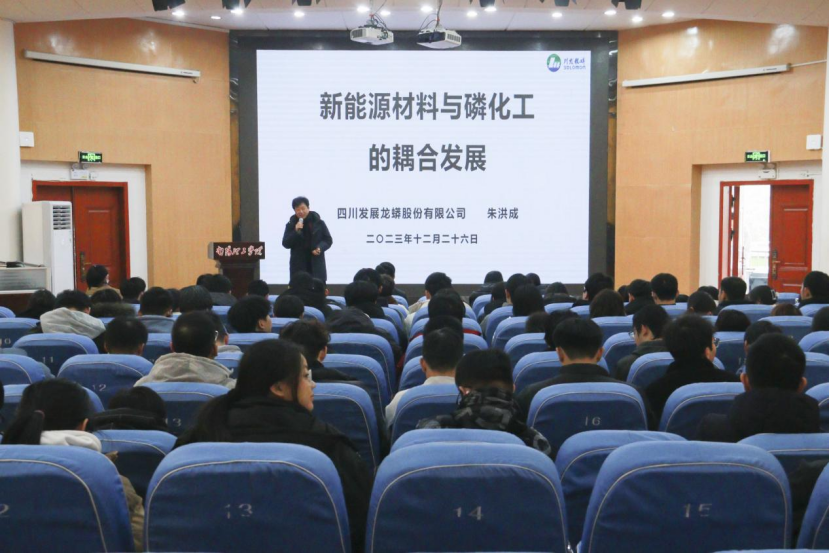 朱洪成以“新能源材料与磷化工的耦合发展”为主题,从我国的能源危机、新能源与新能源材料、电池材料中磷酸铁锂的地位、磷酸铁锂推动磷化工行业革命、绿色化工与清洁生产、职业规划建议六个方面进行讲述。他结合我国石油现状和时代经济“绿色复苏”的时代背景,向同学们分析了新能源的发展以及前景。他重点讲解了磷化工产业在实业中的运用,帮助同学们进行职业规划,并强烈建议同学们提高自身写作水平,希望同学们把自己与国家的命运紧密联系,把论文写在祖国大地上。讲座过程中,公司代表和学生进行了充分的交流沟通,朱洪成等人耐心、热情地解答了学生们的相关问题。康磊根据朱洪成的讲话对同学们提出了建议,希望广大学子能够立足专业、提升技能,夯实基础、练就本领,以无悔奋斗谱写新时代华章。