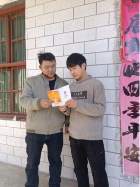返回家乡后,石俊超结合所在家乡的实际情况,走访了家乡经济困难的家庭,深入了解其家庭经济状况和学生学习情况,了解了家庭经济困难的学子在求学路上的顾虑。石俊超通过发放宣传材料与讲解相结合的方式,向其详细介绍了国家及学校的资助政策,并结合自身经历讲述了其在资助政策的帮助下进入大学、成长成才的事例。他认真耐心的为家长和学生解疑答惑,展示了学校对家庭经济困难学生的关怀和爱护,鼓励家庭经济困难学生认真学习、自立自强、奋发向上,用知识作为进步的阶梯,用努力创造美好的未来,用行动去实现自己的梦想。