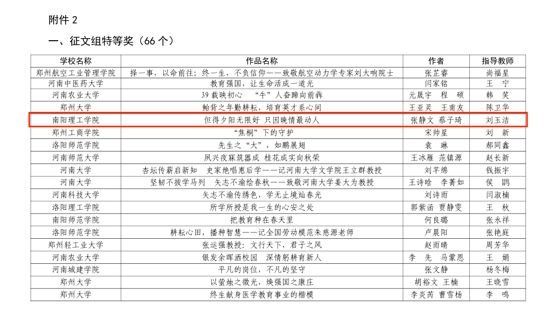 本网讯(学生通讯员/苏卓然 陈佳镓)近日,教育部关工委2024年“读懂中国”活动、河南省教育厅关心下一代工作委员会主办的全省高校“读懂中国”活动评审结果相继公布。我院张静文、蔡子琦撰写,刘玉洁老师指导的《但得夕阳无限好 只因晚情最动人》,李磊、何淑雅撰写,张梦老师指导《心有半亩田 圆办大学梦》获河南省高校征文组特等奖。《但得夕阳无限好 只因晚情最动人》获教育部关工委2024年“读懂中国”活动征文优秀奖。