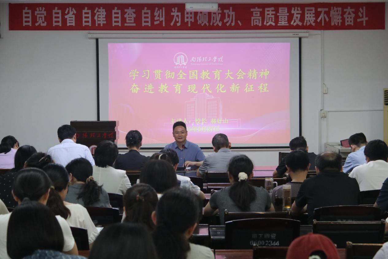 郝好山紧紧围绕学习贯彻全国教育大会精神及《教育强国建设规划纲要(2024—2035年)》主题,结合新时代我国教育事业取得的历史性成就、发生的格局性变化与自身实际,系统阐述了教育强国的科学内涵和基本路径,深刻阐述了教育强国建设要正确处理好的重大关系以及全面推进强国建设的战略任务和重大举措,既有政治高度,又有理论深度,更有实践广度。他勉励学院师生要始终坚持以习近平总书记关于教育系列重要讲话和指示精神为指导,树立远大理想、精进业务本领、锤炼意志品质、赓续优良传统,进一步坚定建设高水平应用型理工大学的自信和自觉,不断增强使命感和责任感,充分发挥学院人才培养优势和特色,潜心立德树人,执着攻坚克难,为加快推进教育强国、科技强国、教育强国建设,提升有组织科研水平、办学层次和应用型人才培养质量作出南工生化更大贡献。