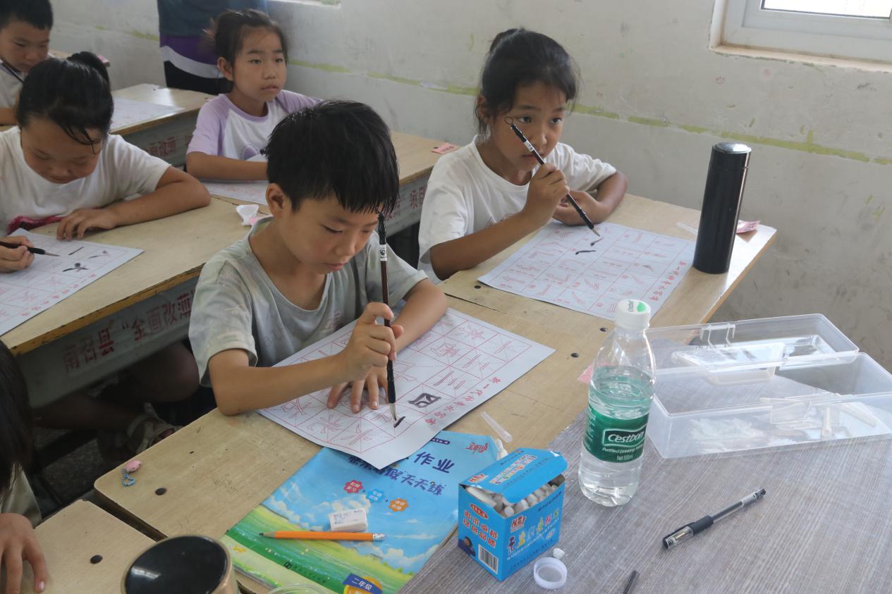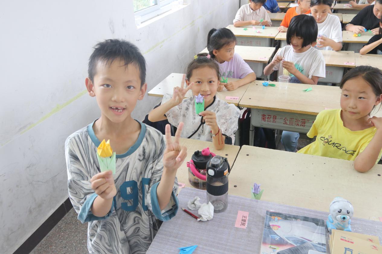 在音乐课上,支教队员教孩子们学唱歌曲,以简单易学的旋律丰富课堂内容。手工课上,队员向孩子们分发彩纸,并逐步示范折叠、裁剪步骤,指导孩子们完成花朵制作。书法课分为软笔与硬笔教学,队员从基础笔画入手,耐心指导孩子们练习书写,帮助他们掌握书法技巧,感受传统文化的独特韵味。