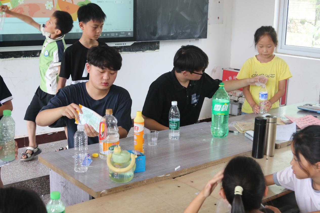 在科学实验课上,支教队员充分发挥专业特长,将晦涩的科学知识转化为生动有趣的实践活动。课前,队员们会细致讲解实验原理和操作步骤,为孩子们搭建起扎实的知识框架。课堂上,各类趣味实验轮番登场,点燃了孩子们探索科学的热情。在“大象牙膏”实验中,队员们先引导孩子们将洗洁精与白醋混合,随后让孩子们亲手调配溶液,当大量泡沫如喷泉般涌出时,孩子们不禁发出阵阵惊叹;“香蕉DNA提取”实验里,孩子们化身小小科学家,通过碾碎、过滤、添加酒精等步骤,成功提取出香蕉的DNA,触摸到科学的奥秘;“碘伏维C氧化还原”实验更别具匠心,队员们创新性地引导孩子们利用化学反应原理,在纸上创作出奇妙的画作与文字。一个个简单而神奇的实验,不仅让孩子们直观感受到科学的魅力,更在他们心中播下了探索未知的种子。
