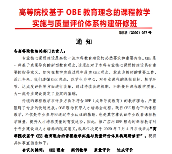 本次线上培训由温州大学施晓秋教授主讲,从教学策略与方案设计、教学质量与效果评价等六个方面讲解了遵循OBE理念的课程教学;从毕业要求达成评价现存不足的分析等四个方面讲解了毕业要求达成导向的教学质量与学生发展评价跟踪机制。
