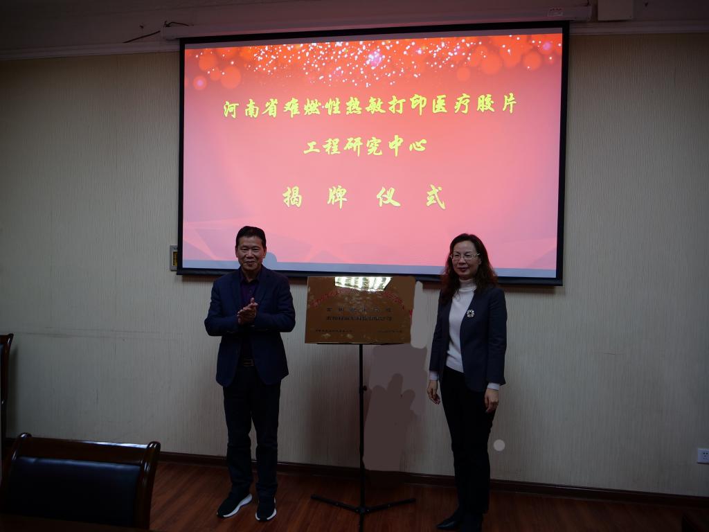 张爱红和张和平为“河南省难燃性热敏打印医疗胶片工程研究中心”揭牌。