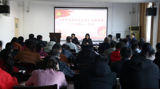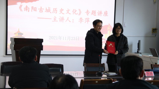 本网讯(特约记者/路守通)11月23日,生物与化学工程学院于9225会议室举办“南阳古城历史文化”专题讲座,本次讲座由南阳日报“直播南阳”云播台副台长李萍主讲,校党委组织部副部长王耀辉、生化学院领导班子成员及全体教师参加此次讲座。