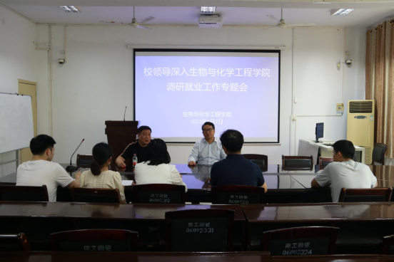 本网讯(特约记者/路守通)6月2日,副校长葛晨光、招生就业处处长胡楠深入生物与化学工程学院调研就业工作,学院党委书记康磊、院长罗建成、党委副书记刘玉洁以及学院辅导员老师陪同并参与座谈会。