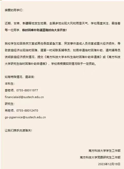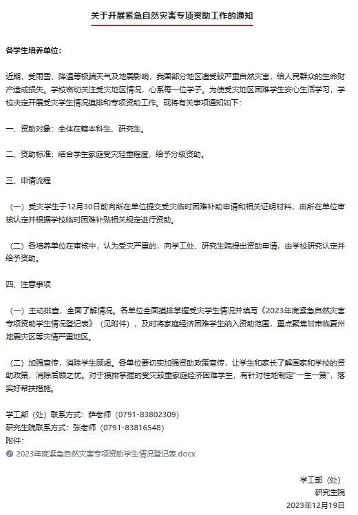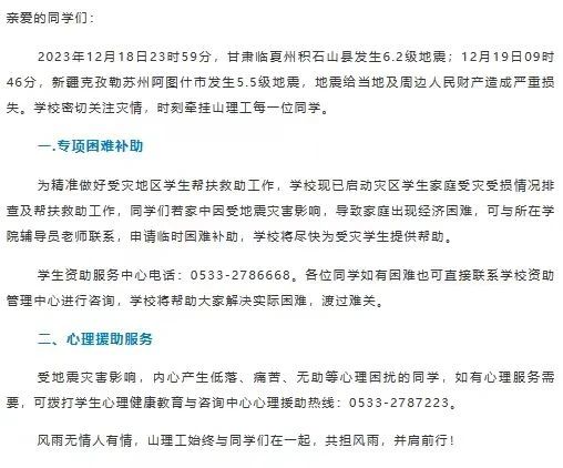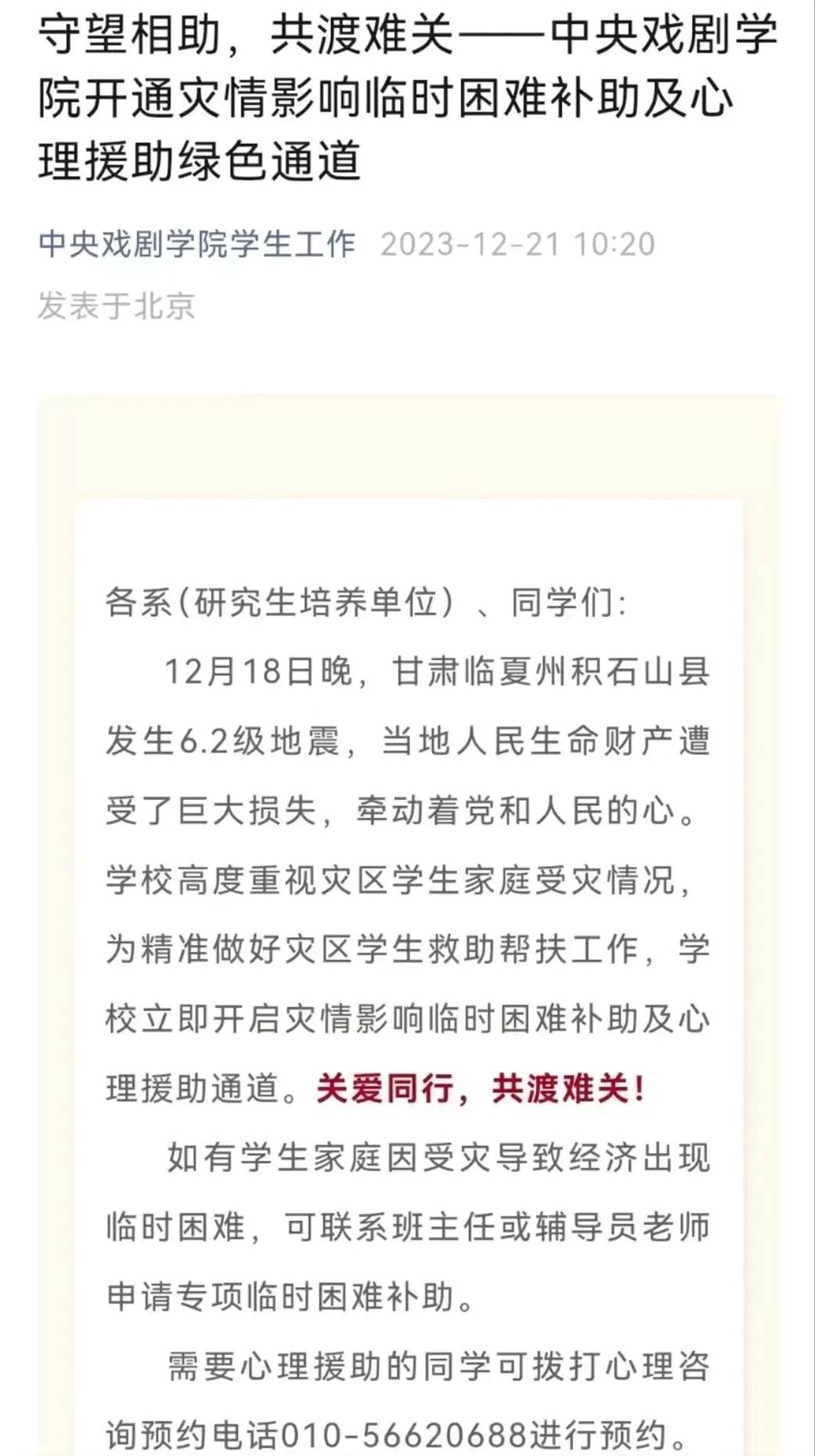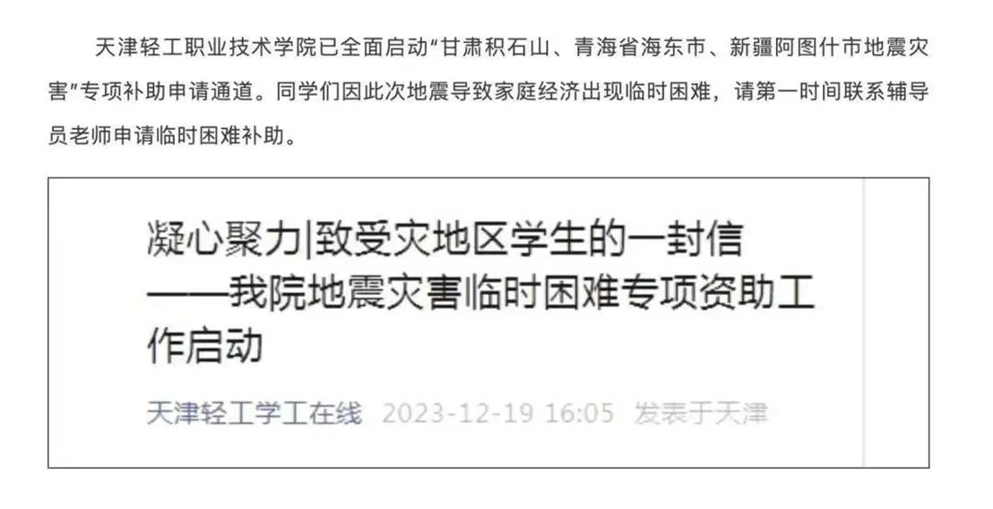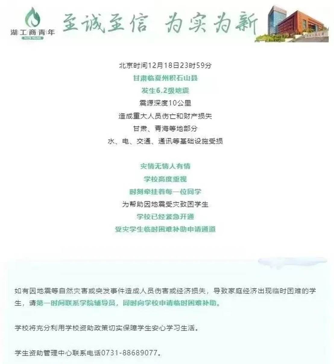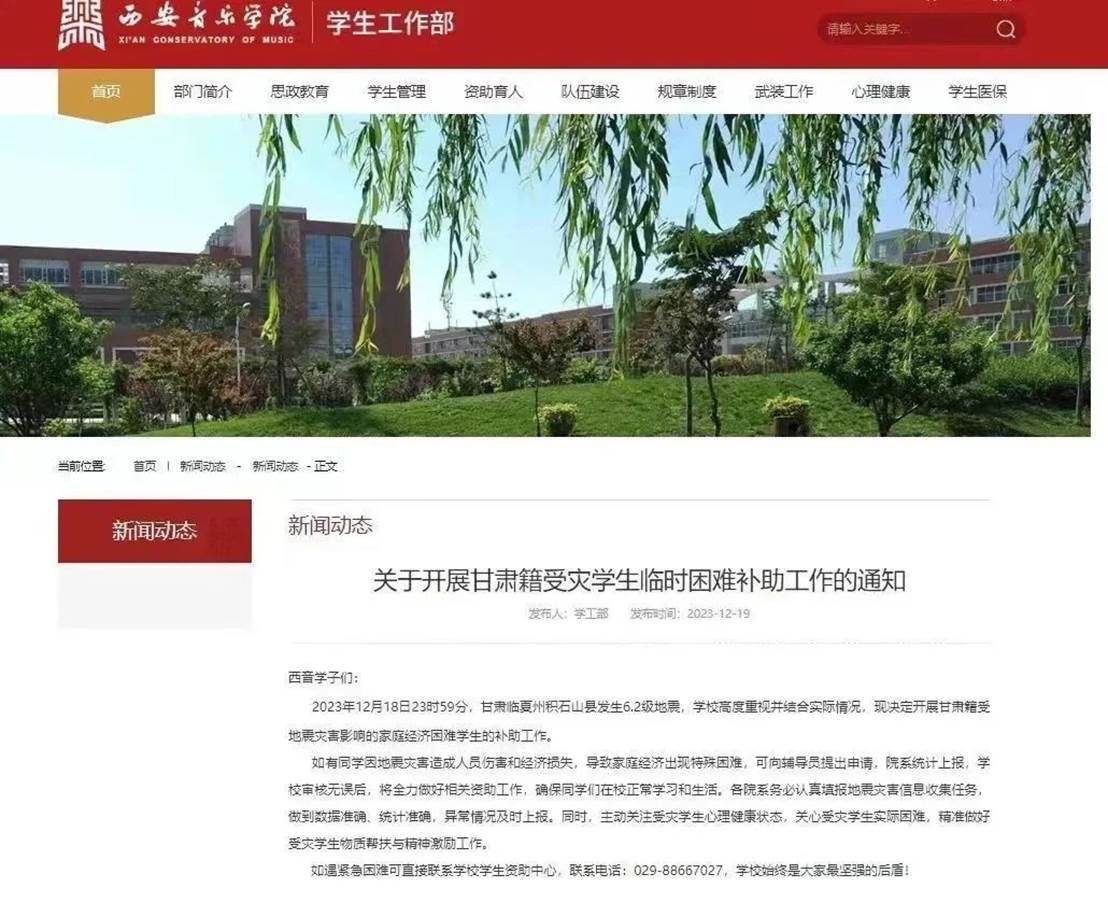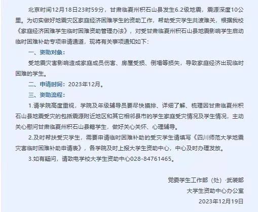 甘肃积石山地震发生后,全国各地高校学生资助管理部门紧急行动,迅速排查家在受灾地区的本校学生,并提供紧急帮扶,确保他们安心就学。