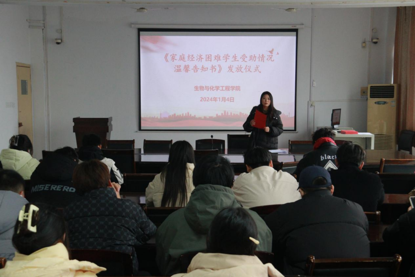 本网讯(学生通讯员/曹海贝 胡煌烨)1月4日,生化学院于9225会议室举办《家庭经济困难学生受助情况温馨告知书》发放仪式,资助专干老师李玉玺主持此次仪式,国家助学金获得学生参加。