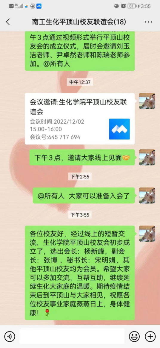 由于疫情影响,本次平顶山校友联谊会成立仪式采取视频连线的方式进行。刘玉洁表示母校非常关心各位校友的发展,联谊会是校友间沟通的平台和校友联系母校的纽带,通过开展校友活动,校友们可以联系更加紧密,也可以更多地关心、关注、支持和推动母校事业发展。团学办主任尹卓然代表生化学院对平顶山校友联谊会的成立表示祝贺,并向校友们介绍了学校及生化学院近年的发展情况和取得的成绩。参与会议的校友回忆了自己在校内的点滴生活,并各自分享了自己目前的工作以及当下的生活状态,表达了对老师同学的思念和对母校的感恩之情,并为母校的发展感到由衷的欣慰。平顶山校友联谊会选举杨新峰为会长,张博为副会长,宋明娟为秘书长。校友们纷纷表示,今后会继续关心、支持学院发展,随时响应母校召唤。