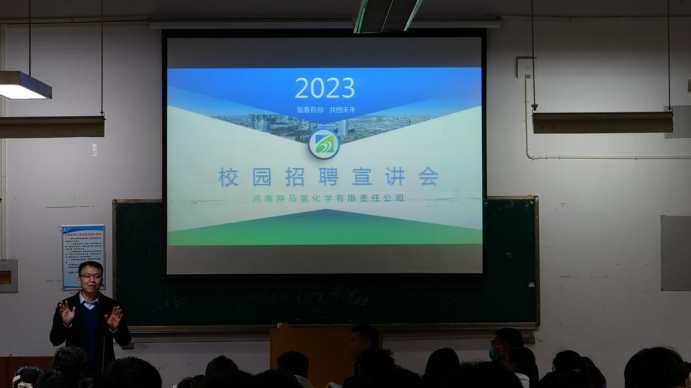 会议结束后,王大勇针对毕业生进行了企业宣讲,他播放了河南神马氢化学有限责任公司的相关视频,介绍了企业的现状和未来规划,详细讲解了企业招聘要求、福利待遇和报名方式等。在现场,王大勇认真聆听同学们提出的各类问题,从衣食住行到工资待遇都做出详细回答,积极与同学们互动,鼓励有意向的同学到公司就业实习。