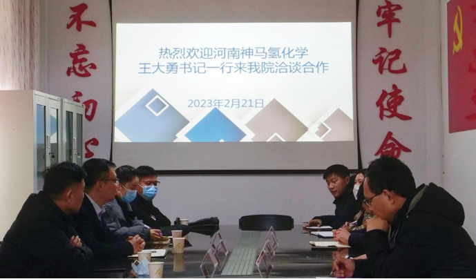 康磊对河南神马氢化学有限责任公司王大勇书记一行的到来表示热烈欢迎,并对我院专业设置、科研成果、实验设备、校企合作等方面作了简要介绍。王大勇对学院的热情接待表示感谢,并就河南神马氢化学有限责任公司的发展历史、公司理念、特色优势产品以及对公司成立以来的研究成果做了详细的介绍。双方就校企合作内容达成初步合作意见。