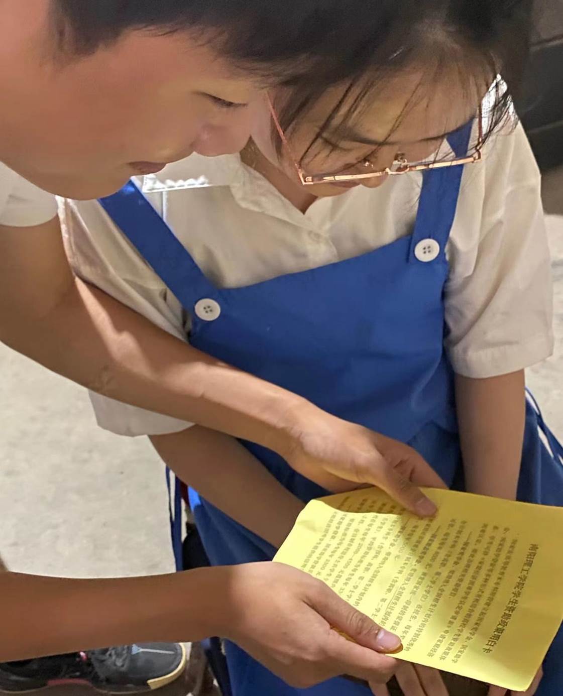 生化学院学生张安瞳作为资助宣传大使深入社区,了解当地群众对国家学生资助政策的知晓度,向学生分发资助政策宣传材料,帮助他们更好地了解南阳理工学院资助政策,积极解答学生以及家长的疑惑,消除“寒门难出贵子”的顾虑,鼓励家庭经济困难的中学生笃志学习,任何经济困难国家和学校都会有政策帮扶。