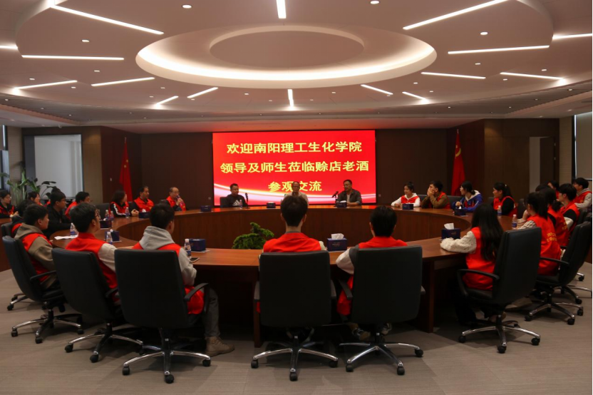 赊店老酒人力资源部经理魏丹萍、生产部经理刘延年等对生化学院师生一行人的到来表示欢迎。在赊店老酒股份有限责任公司负责人的带领下,一行人参观了酿酒车间、包装车间。在白酒生产车间,王春艳为学生们讲授了白酒固态发酵原窖工艺流程。随后,双方就当前形势研判、如何促进宛酒销售问题以及宛酒在生产、技术、风格、品质创新等方面谈论了具体看法,并就宛酒在发展中存在的问题以及营销战略、产品建设、品牌塑造、宣传推广等方面进行了热烈地讨论。李慧星表示,社旗县科技创新服务中心在生态酿酒行业学院研学活动前期筹备过程中提供了很大的支持,双方将会加强合作,建立长效沟通机制,共同推动校企双方协同发展。
