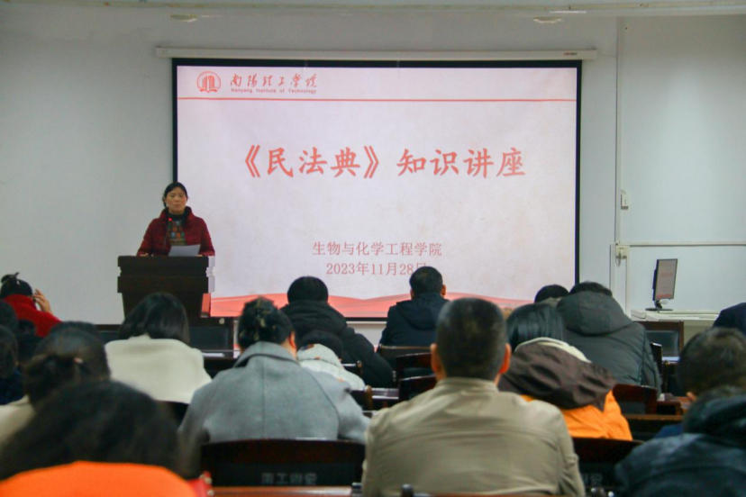 本网讯(学生通讯员/曹海贝 杨斌)11月28日,生化学院于9225会议室举办《民法典》知识讲座,本次讲座由河南言莹事务所张艳律师担任主讲,生化学院党委副书记刘玉洁主持,生化学院领导班子成员及全体教职工参与。