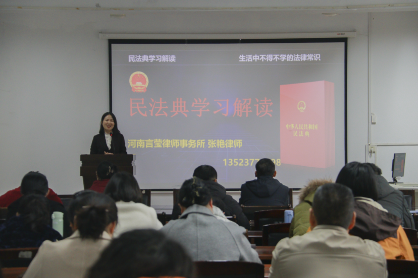 张艳律师介绍了《民法典》的诞生及其影响,从基础民法典知识讲述民法对公民的重要性。她以鲜活的案例为引导,从财产安全、邻里纠纷、婚姻等方面涉及的法律问题解读《民法典》对群众民事权利和民事义务的各项规定。她不仅以幽默且贴近生活的解读方式捕捉参会人员的吸引力,并借由深入思考与客观观察呈现出《民法典》的种种规定,赢得了现场教职工的阵阵掌声。