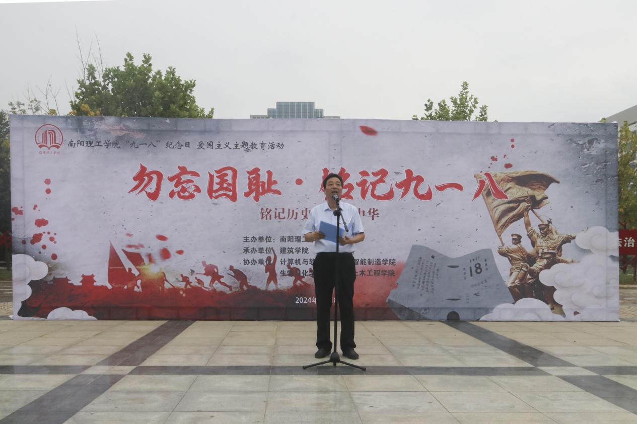 本网讯(学生通讯员/胡煌烨 王鸿焜)为引导广大青年学子铭记历史,缅怀先烈,9月18日,由南阳理工学院学生处主办,建筑学院承办,生物与化学工程学院协办“勿忘国耻·铭记九一八”爱国主义教育活动在齐贤广场举行。南阳理工学院党委副书记、校工会主席董豪,校党委宣传部部长逯忆,学校各职能部门以及各学院负责人出席,24级新生参加。