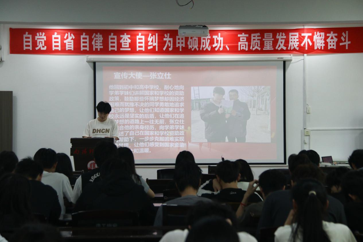 学生资助宣传大使李隽瀚系统解读了国家奖学金、励志奖学金、助学金等政策细则与申请流程,同时介绍勤工助学、学费减免等校内资助渠道,为学生提供多元支持方案。学生资助宣传大使郑潇恒以身边真实案例展开分享,让他深刻体会到奖助学金并非冰冷的数字,而是助力学子公平追梦的希望之光。学生资助工作站向全员学生发起倡议,鼓励有意减轻家庭负担、追求学业发展或渴望实践提升的同学积极咨询,学校资助中心教师、辅导员及学生宣传大使团队将提供专业指导与帮扶。