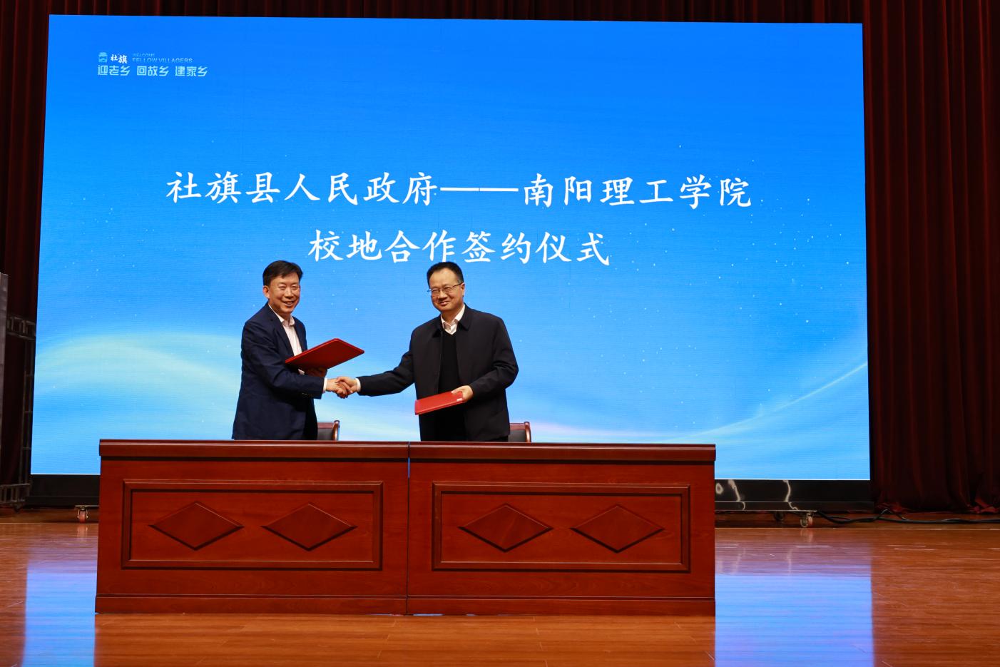 本网讯(特约记者/宋学宁)4月5日下午,南阳理工学院与社旗县人民政府在社旗县文展中心隆重举行“校县融合发展战略协议”签约仪式。副校长蔡广宇,社旗县委副书记、县长关文波,县委常委、组织部长马珂等出席,生物与化学工程学院党委书记李冉,社旗县委办、政府办、县委组织部等县直单位负责人和企业代表参加。副校长蔡广宇与社旗县人民政府副县长吴凯代表校县双方签署协议,标志着双方合作开启全新征程。