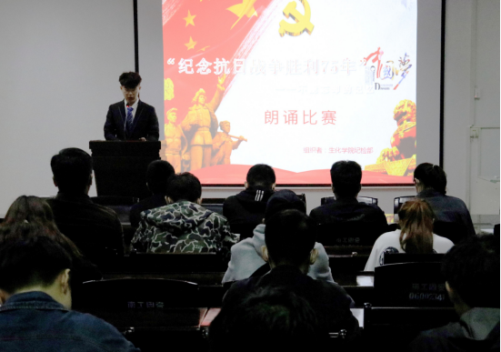 本网讯(学生通讯员/李卓 王仁祥)9月21日晚,生化学院在9225会议室举办“纪念抗日战争胜利75周年”朗诵比赛。学生会主席团及各部部长担任评委,各班学生代表观看比赛。