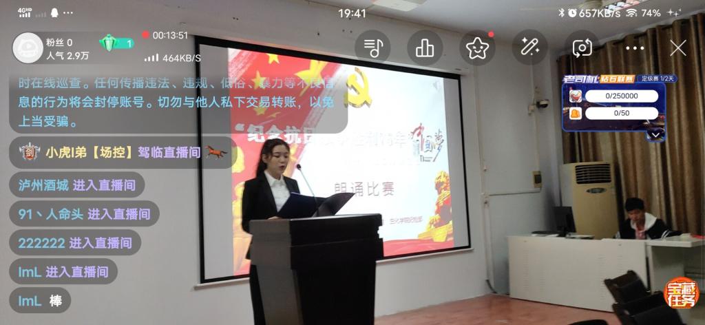 十四位参赛选手按照抽签顺序依次上台演讲。比赛中,选手们“以诗言志、以诵传声”,用真挚的感情追忆了那段奋起抗战的峥嵘岁月,大家或慷慨激昂、或深情诉说,用声音把观众和评委们带回到那个烽火连天、硝烟弥漫的抗战年代,再现了抗日英雄保家卫国的英勇事迹。19生物班冯佳琪朗诵的《沿着先辈足迹,承载时代梦想》表达了对无数英勇牺牲先烈的深切缅怀之情;19生物班王静雯朗诵的《铭记历史,开创未来》字正腔圆,感情饱满,惊醒我们铭记历史,珍爱和平,为实现伟大中国梦而努力。最终,19出国班王俊英和付婷婷以优异的成绩获得此次演讲比赛一等奖。同时,本次朗诵比赛还在虎牙平台开启了直播模式,让到达现场的同学们也能在参赛选手的朗声中追忆峥嵘岁月,线上观看热度高达2.9万。