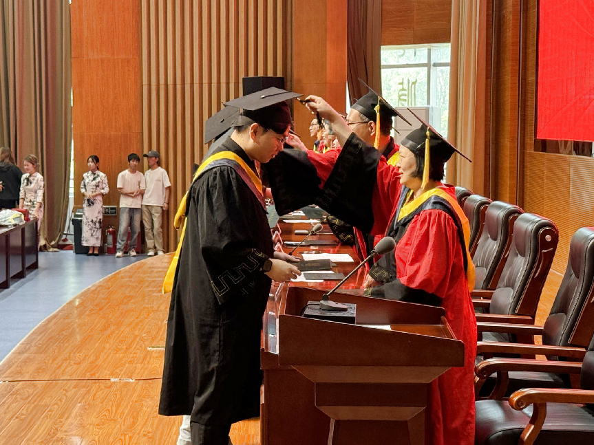 全体起立奏唱国歌。典礼上宣读2025届毕业生获得学士学位名单及2025届毕业生考取硕士研究生录取情况,并对省级、校级优秀毕业生进行表彰,学院主要负责人为全体毕业生拨苏正冠、颁发学位证书。