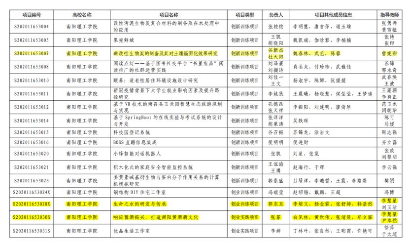 自训练项目开展以来,学院师生踊跃参与,精心准备,合理分工,团结协作。经过反复的修改、补充、优化后,我院最终在此次训练计划项目中取得优异成绩。由李慧星、张梦老师指导的王平、靳心如团队创新训练项目“橡木桶贮存浓香型白酒成分变化规律研究”,曾宪彩老师指导的谷新杰、杜天阳团队创新训练项目“磁改性生物炭的制备及其对土壤镉固化效果研究”,李慧星、刘玉洁老师指导的郭东东团队创业训练项目“生命之水的研发与传承”,李慧星、尹卓然老师指导的张菲团队创业实践项目“相应豫酒振兴,打造南阳黄酒新文化”入选省级训练项目;李慧星、陈瑞老师指导的郑立霖团队创业训练项目“青春美酒的酿造与销售”,李慧星、郭书贤老师指导的丁菱菱团队创业训练项目“贫从茸脱,天因茸蓝”,李秉轲、李焕新老师指导的韩智豪团队创新训练项目“四氢蝶啶PLK1抑制剂的定量构效关系的分子动力学模拟研究”入选国家级项目。