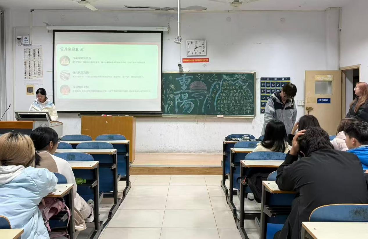 本网讯(学生通讯员/陈佳镓)为传承中华优秀传统文化,培育同学们的敬老、爱老、助老意识,10月26日,生化学院于9号教学楼自习室开展“爱暖重阳 敬老传情”主题班会。