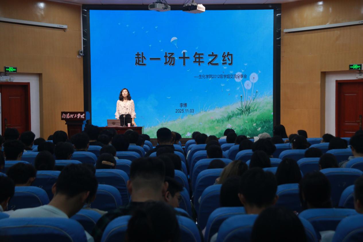 本网讯(学生通讯员/陈佳镓)11月3日,生化学院于第二报告厅举办校友大讲堂,本次活动由25级辅导员路守通主持,2012级毕业生李博主讲,25级学生参加。