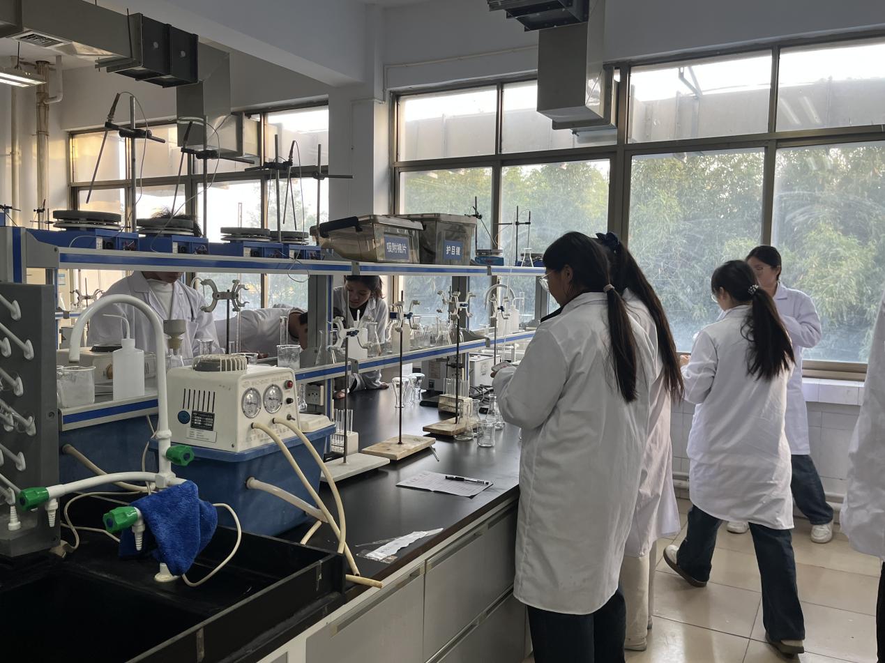 初赛阶段,各班级于自习室内集中答题,重点考察参赛学生的理论知识储备水平。经选拔,每班择优推选三名同学组成代表队晋级复赛。复赛按年级分时段进行,设置必答题与抢答题两个环节,采取班级两两对决形式。经过多轮角逐,最终十支优胜队伍成功晋级决赛。决赛现场,不同年级的竞赛内容各有侧重。大一组比赛重点考察基础实验技能的规范性,评委们从仪器选型与摆放、核心组件安装精度、接口连接与密封性、操作规范与安全意识以及实验台整理等多个维度,对参赛队伍进行严谨细致的评分。大二组的竞赛项目为“食用醋中总酸量的测定”,更具综合性与应用性。评委老师全程密切关注各小组的实验操作流程,确保评判的公正与准确。经过激烈的角逐,最终大一组:出国班获得一等奖;生物中外三班、应化中外三班获得二等奖;化工班、生物中外一班获得三等奖。大二组:应化一班获得一等奖;出国班、应化中外一班获得二等奖;应化二班、化工一班获得三等奖。
