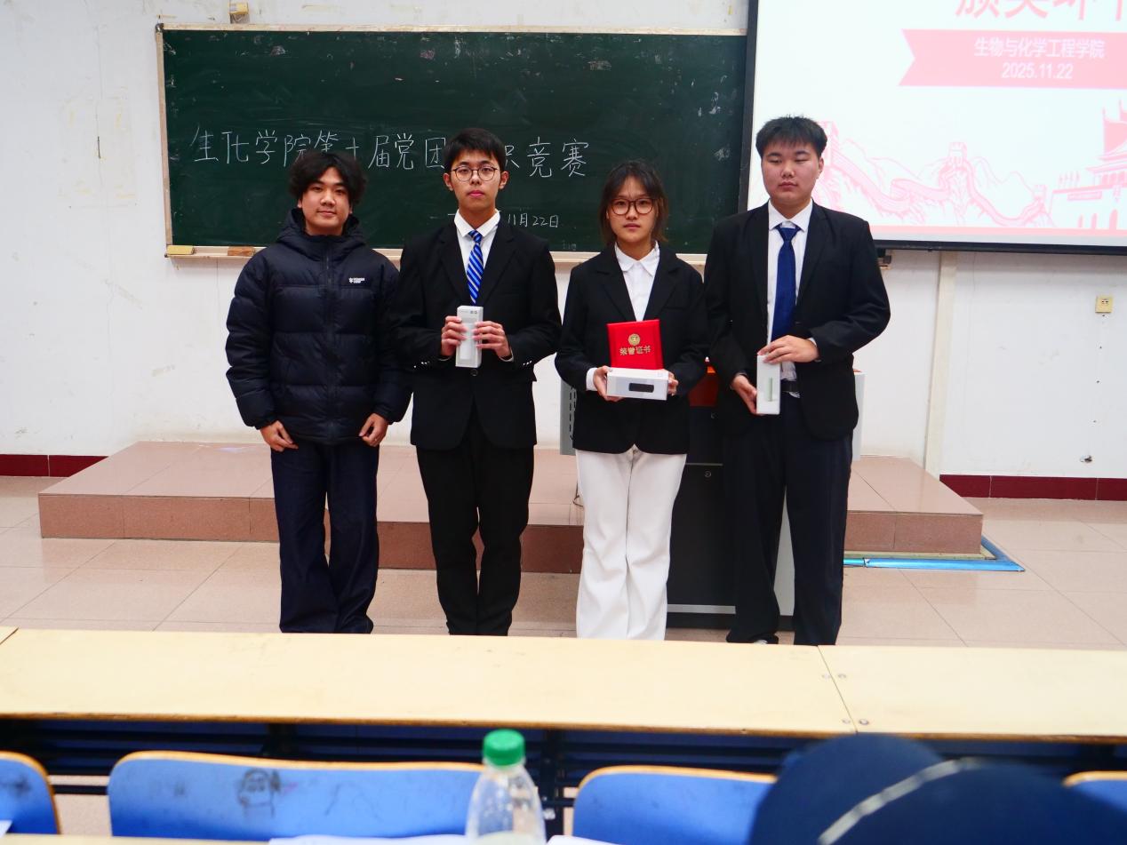经过初赛选拔,各有五支优秀队伍脱颖而出,成功晋级决赛。决赛设置个人必答题、抢答题和团队必答题三个环节,竞赛内容紧扣党团理论核心,涵盖党章党规、党的历史、团务知识等重点内容。比赛过程中,各参赛队伍精神饱满、配合默契,展现出扎实的理论功底和良好的团队协作能力。在团队必答题环节,队员们集思广益、分工协作,将现场气氛推向高潮,充分体现了团队的凝聚力与向心力。经过多轮激烈角逐,最终,大一组:应化班获得一等奖;应化中外二班获得二等奖;应化中外三班、化工班获得三等奖。大二组:生物中外二班获得一等奖;生物一班、化工一班获得二等奖;应化中外一班、生物二班获得三等奖。梁瀚余和主席团成员依次为其颁发荣誉证书和奖品。