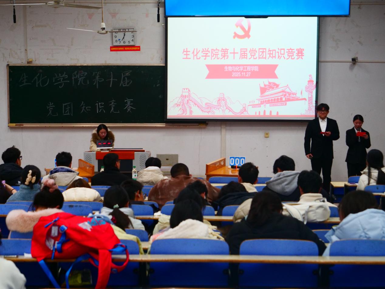 本网讯(学生通讯员/陈佳镓 刘观锋)11月22日、11月27日生化学院于6教101阶梯教室分别举办大一、大二组第十届党团知识竞赛,团学办梁瀚余老师和主席团成员出席并担任此次评委,部分学生观看。