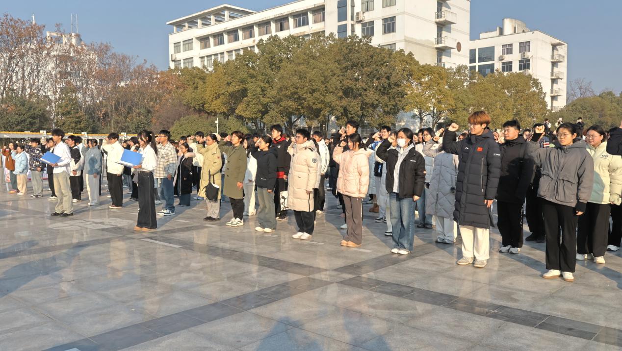 本网讯(学生通讯员/陈佳镓 王冬怡)为深化新生入学教育内涵,厚植爱国情怀,12月6日,我校在齐贤广场开展纪念“一二·九”运动90周年主题实践活动,生化学院2025级全体学生参加。