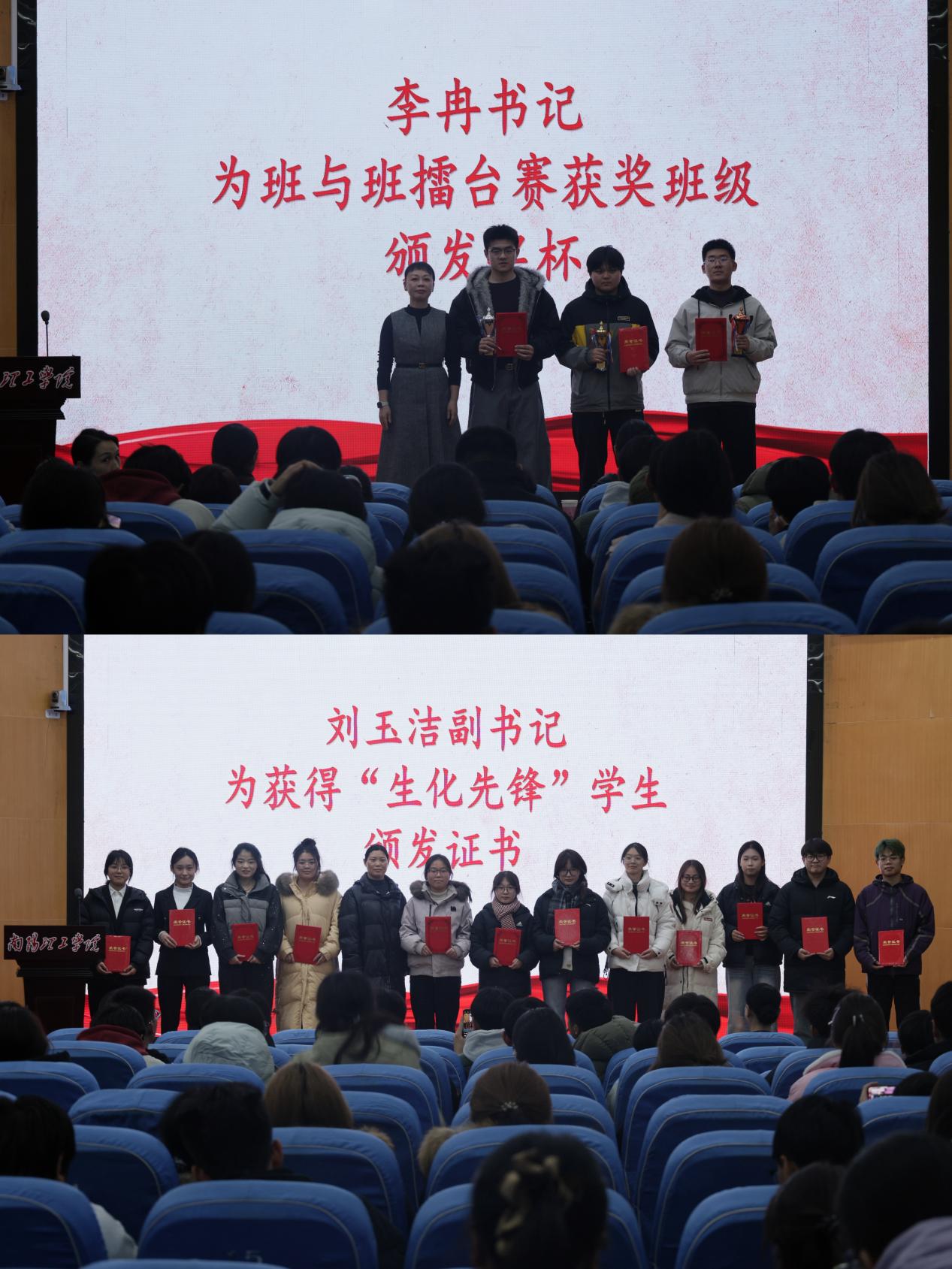 在先锋分享环节,学生干部先锋黄垚飞分享了学生工作中的责任担当与成长收获;志愿服务先锋龚忆坤结合科技馆讲解经历,讲述了服务过程中的蜕变与感悟;学业奋进先锋王乐乐介绍了高效学习方法与备考经验;创新创业先锋吴泽凯分享了科研项目攻关历程与创新体会。最后张梦老师宣读了2025年“班与班擂台赛”获奖班级名单,陈瑞老师宣读了2025年“生化先锋”学生名单。李冉、刘玉洁分别为获奖班级与先锋学生颁发奖杯、证书并合影留念。