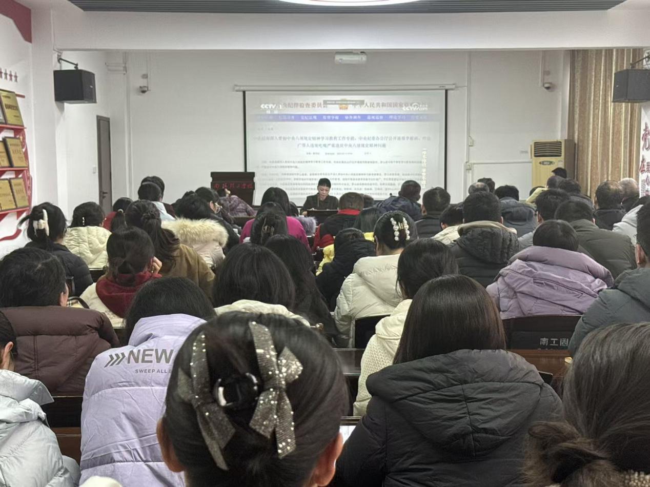 会上,党委书记李冉发表专题讲话。她紧扣中央八项规定精神要求,聚焦“违规吃喝”等作风领域易发多发问题,要求全体教职工必须时刻绷紧纪律规矩这根弦,始终保持清醒头脑,做到严于律己、慎独慎微。同时,她结合师德师风建设要求,指出廉洁是从教之基,全体教职工需坚守教育初心,恪守职业道德,以清正之风涵养育人环境,坚决杜绝腐败行为滋生。最后,全体参会人员共同观看了党风廉政教育警示片,影片通过真实案例以案释法、以案明纪,深刻剖析了违纪违法问题的根源与危害,为全体职工敲响了廉洁自律的警钟。