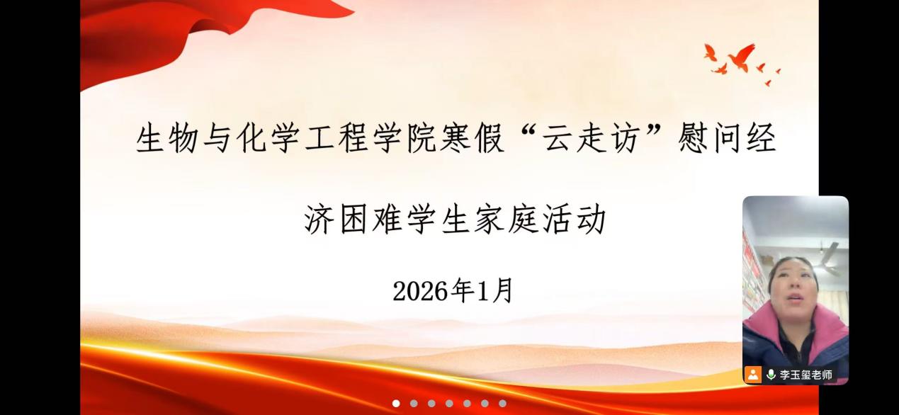 本网讯(学生通讯员/陈佳镓 胡巧诗)为贯彻落实国家、学校相关资助政策,深入了解家庭经济困难学生的寒假生活与家庭状况,2026年1月21日,生化学院组织开展“云走访”线上慰问活动。活动由资助专干李玉玺老师主持,团学办公室老师共同参与,学院全体受助学生在线参加。