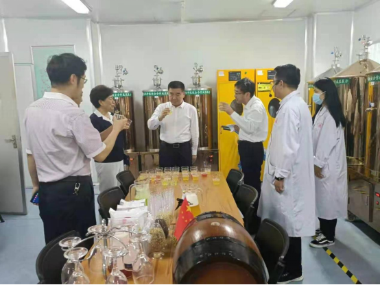刁玉华副厅长与实验室工作人员就精酿啤酒设备、产品种类和特点进行了详细探讨,鼓励教师和学生们百尺竿头更进一步,争取获得更大的荣誉。