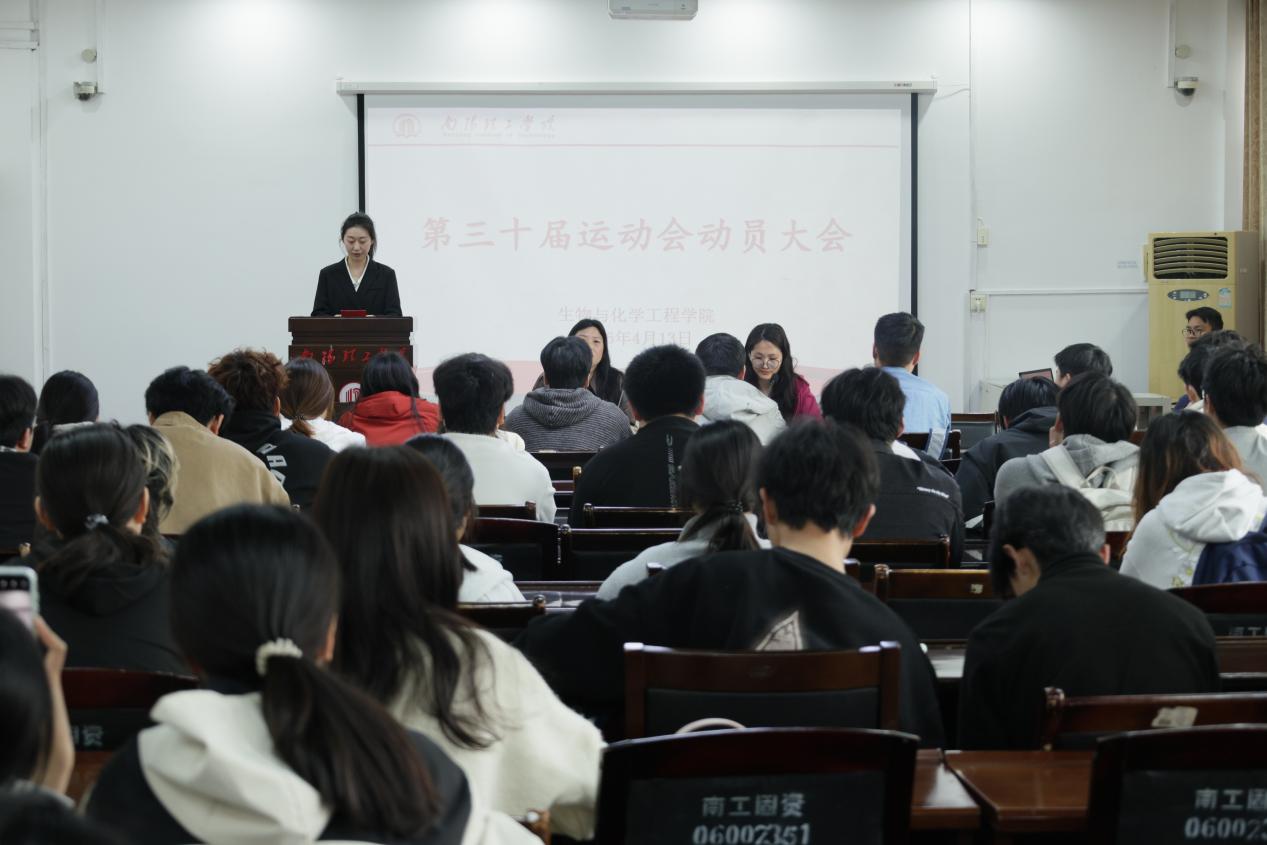本网讯(学生通讯员/陈佳镓 胡巧诗)2026年4月13日,生化学院于9225会议室举办第三十届田径运动会动员大会,此次大会由学院党委副书记刘玉洁主持,团学办主任张梦主讲,学生会成员以及全体运动员参加。