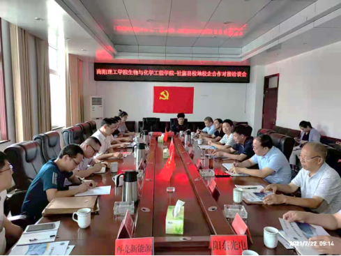 本网讯(特约记者/刘建连)7月22日上午,南阳理工学院生物与化学工程学院——社旗县校地校企合作对接洽谈会在社旗县产业集聚区管委会举行。生物与化学工程学院党委书记康磊、副院长刘学国等一行8人参加了本次洽谈会,社旗县产业集聚区管委会主任吴凯以及南阳杜尔气体装备有限公司等13家企业代表出席会议。