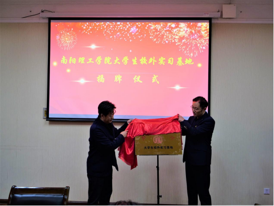 生化学院党委书记康磊和范一兵为“南阳理工学院大学生校外实习基地”揭牌。