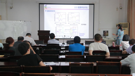 陈俊玲博士以“基于多羚酸芳基謎类配体的金属有机框架的构筑及性质研究”为题作报告。其从金属-有机框架化合物的特性着手,引出刚性配体与柔性配体的优缺点,从而详尽的从拓扑调控、光化学、电化学和主客体作用四个方面介绍了半刚性配体,尤其是半刚性芳基醚配体的特点,讲解了具有羧酸-水氢键网络的金属有机框架化合物的构筑及电化学水分解研究和氢键辅助的燃料敏化镍基金属有机框架化合物在可见光催化产氢中的应用。与会人员就报告中的专业问题与两位博士展开深入详细的讨论与交流。