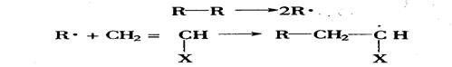 链引发反应是形成单体自由基的反应,热、光、高能辐射等均可直接使单体产生自由基,但较常用的是从容易分解成自由基的化合物(引发剂)来得到。引发剂主要是过氧化物和偶氮化合物,在加热条件下分为两个自由基。