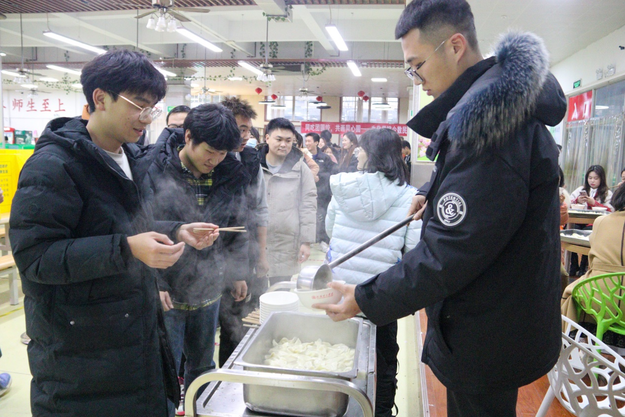 同学们经过短暂的准备后,便在餐厅内忙碌着,在多次尝试后逐渐的得心应手,师生们分工合作,一边包着饺子一边聊着家常。经过师生们的共同努力,一个个形态各异的饺子整齐的排列着,不同形状的饺子体现着不同地域的风俗习惯。大家把节日的祝福包在寄托着团圆之情的饺子内,让学生们感受到了生化大家庭的温暖。