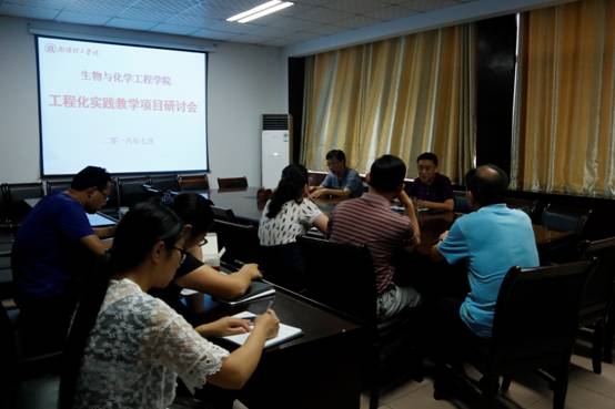 随后,教研室主任分别汇报了各专业工程化实践教学项目的进展情况,应用化学、化学工程与工艺、生物工程、食品科学与工程专业都初步确定了各自的工程实践项目并制定了工程综合实训教学大纲。经过讨论,发现存在工程综合实训教学大纲内容不够详细、工程综合实训场地空间不足等问题,这些问题将得到进一步的处理。