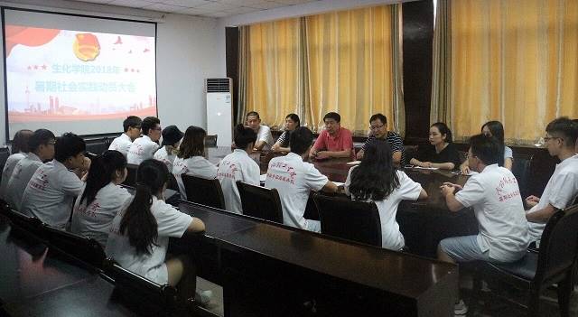 本网讯(学生通讯员/周畅)6月29日,生化学院在2号教学楼2楼会议室召开2018年暑期社会实践动员大会。生化学院院长、党委书记郭书贤,党委副书记田永磊,团学办全体教师及参与暑期社会实践的学生代表参加大会。